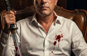 A powerful cinematic portrait of a fearless crime lord sitting confidently on an ornate vintage leather armchair, holding a blood-stained katana sword resting against the armrest, wearing a slightly unbuttoned white …