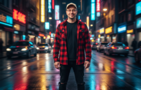 A dramatic cinematic-style photo taken on a modern city street at night with bright neon lighting. A man, good-looking, standing in the middle of the street, facing the camera …
