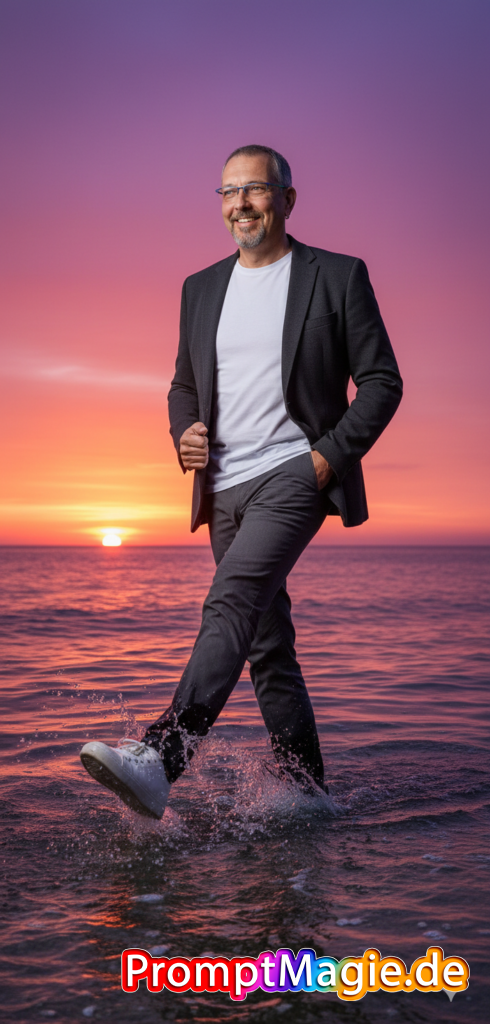 Erstelle ein hyperrealistisches 8K-Ganzkörperporträt, aufgenommen mit einem 50-mm-Objektiv aus einer leicht niedrigen Perspektive, hebt den Mann vor dem atemberaubenden Hintergrund eines Sonnenuntergangs hervor. Die Komposition platziert ihn leicht rechts, während die leuchtende untergehende Sonne links am Horizont steht und so eine dramatische, filmische Gegenlichtbeleuchtung sowie eine starke Streiflichtwirkung auf seiner linken Seite erzeugt. Der Himmel schimmert in leuchtenden Violett-, Rosa-, Orange- und Gelbtönen, durchzogen von sanften, verstreuten Wolken, die das warme Licht reflektieren. Der Mann ist in voller Bewegung im flachen Meerwasser zu sehen, sein rechtes Bein angehoben, wodurch dynamische Wasserspritzer um seine weißen Sneaker und seine Hose entstehen. Er trägt ein weißes T-Shirt, ein offenes, dunkelgraues Hemd/Sakko und eine dazu passende dunkelgraue Hose. Seine linke Hand steckt lässig in der Hosentasche, während seine rechte Hand das Revers seines Sakkos offen hält. Er lächelt, blickt leicht nach links. Das Wasser spiegelt die intensiven Farben des Sonnenuntergangs wider, die Wellen und Spritzer geben detailreiche Texturen wieder. Die Szene wirkt insgesamt lebendig, mit volumetrischer Beleuchtung und einer professionellen, detailgetreuen Ästhetik. (Hochgeladenes Gesicht als Referenz.)