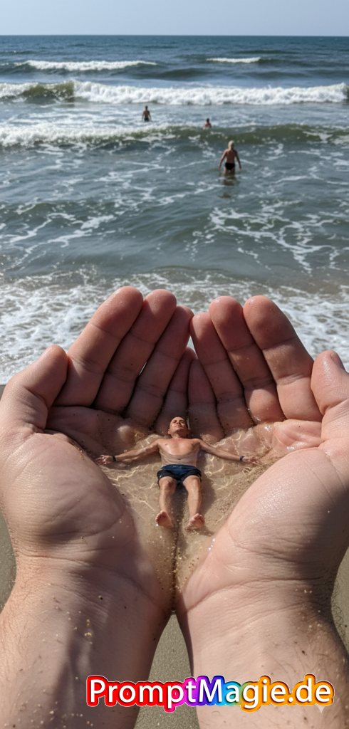 A hyper-realistic, surreal first-person POV shot capturing a mind-bending forced perspective optical illusion where a pair of giant, cupped human hands dominate the immediate foreground, forming a vessel filled with ocean water. Floating effortlessly on his back within this miniature, hand-held pool is a tiny figure with uploaded face as reference, his body relaxed with toes pointing up, wet hair and skin glistening under the natural sunlight. The water contained within the palms seamlessly merges visually with the vast, choppy ocean in the background, creating a seamless continuity between the micro and macro worlds. The hands exhibit extreme textural fidelity with visible fingerprints, pores, fine wrinkles, and scattered grains of sand, illuminated by bright, high-contrast daylight that creates subsurface scattering on the fingertips. The background reveals a wide seascape with rolling dark waves, whitecaps, and a group of distant, out-of-focus figures standing in the surf near the horizon, all rendered in 8k resolution with the clarity of a high-end DSLR camera using a 35mm lens, focusing sharply on the foreground hands and the floating subject while allowing the horizon to fade slightly into atmospheric depth.