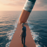 A hyper-realistic, 8k vertical shot with a slightly high-angle, wide-lens perspective captures a surreal scene at golden hour. A colossal, dark teal hexagonal pencil with a silver, ribbed ferrule and a light orange, hexagonal eraser dominates the upper right, with its eraser end pressed firmly onto the ocean surface. This gigantic eraser is actively „erasing“ the water, creating a straight, reddish-brown, textured path that extends into the distance, with small water droplets and eraser-like debris scattering around the point of contact. The path is bordered by foamy white waves crashing gently against its edges, contrasting with the deep blue, rippling ocean. Walking away from the viewer down the center of this path towards the giant eraser is a person wearing a dark grey t-shirt and dark pants, with uploaded face as reference, while turning their head back over their shoulder to look directly at the camera, making clear eye contact. The sky above is a dramatic blend of warm oranges, pinks, and blues, indicative of a sunrise or sunset, with soft, volumetric lighting casting a gentle glow over the entire scene. In the foreground, boldly emblazoned in white sans-serif text on the path, are the words: „IF YOU CAN’T FIND A WAY, MAKE ONE.“ The composition emphasizes the immense scale of the pencil and the conceptual act of creating one’s own path, rendered with cinematic lighting and highly detailed textures throughout.