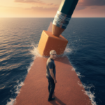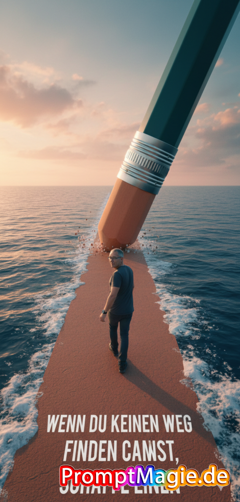 A hyper-realistic, 8k vertical shot with a slightly high-angle, wide-lens perspective captures a surreal scene at golden hour. A colossal, dark teal hexagonal pencil with a silver, ribbed ferrule and a light orange, hexagonal eraser dominates the upper right, with its eraser end pressed firmly onto the ocean surface. This gigantic eraser is actively „erasing“ the water, creating a straight, reddish-brown, textured path that extends into the distance, with small water droplets and eraser-like debris scattering around the point of contact. The path is bordered by foamy white waves crashing gently against its edges, contrasting with the deep blue, rippling ocean. Walking away from the viewer down the center of this path towards the giant eraser is a person wearing a dark grey t-shirt and dark pants, with uploaded face as reference, while turning their head back over their shoulder to look directly at the camera, making clear eye contact. The sky above is a dramatic blend of warm oranges, pinks, and blues, indicative of a sunrise or sunset, with soft, volumetric lighting casting a gentle glow over the entire scene. In the foreground, boldly emblazoned in white sans-serif text on the path, are the words: „IF YOU CAN’T FIND A WAY, MAKE ONE.“ The composition emphasizes the immense scale of the pencil and the conceptual act of creating one’s own path, rendered with cinematic lighting and highly detailed textures throughout.