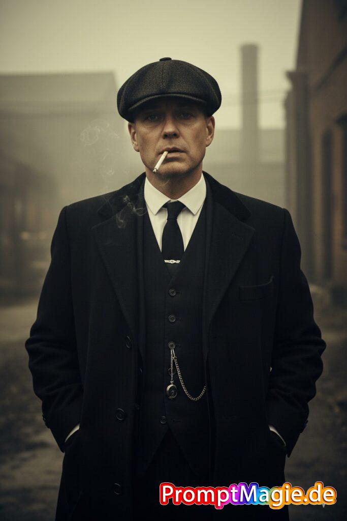 Erstelle ein kinoreifes 9:16 -Porträt von mir als britischer Gangster der 1920er Jahre im Stil von Peaky Blinders, wie ich selbstbewusst in einer nebligen, industriellen Stadelardschaf stehe. Ich trage eimen scharfen schwarzen Dreiteiler, ein hochgeschlossenes weißes Hema, eine schwarze Krawatte mit dezentem Clip und einen schwarzen Wollmantel. Eine schwarze g遇 Schiebermütze wirft einen Schatten über meinen durchdringenden Blick. Eine Zigarette hängt locker aus meinem Mund, der Rauch kringelt sich nach oben. Eine Vintage. Taschenuhrkette verläuft über meiner Weste. Meine Haltung ist entschlossen – Schultern zurück, Kopf leicht geneigt für einen bedrohlichen Ausdruck. Der Hintergrund ist unscharf und stimmungsvoll mit Sepia- Tönen, Nebel und rauen Texturen. Die Beleuchtung ist düster und dramatisch, ganz im Stil klassischer Gangsterfilme.