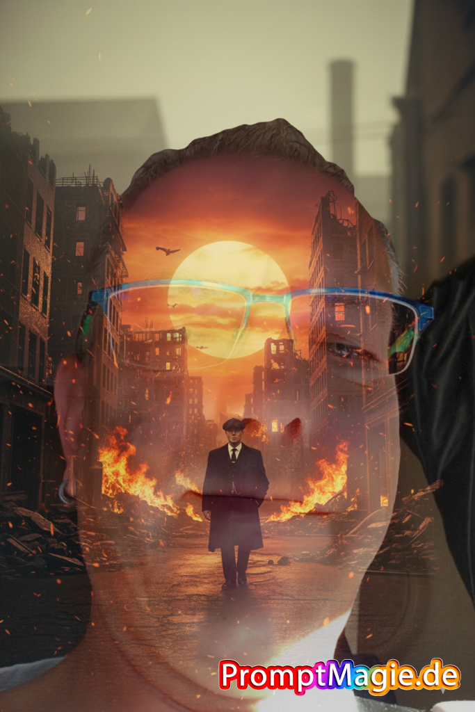 Eine filmische Doppelbelichtung von mir im Profil, mit einem post-apokalyptischen Stadtbild in seiner Silhouette. Die innere Szene zeigt den Mann, der durch eine zerstörte, brennende Stadtstraße, Gebäude in Ruinen, glühende Glut und Feuer geht, mit einem dramatischen Sonnenuntergang im Hintergrund. Stimmungsvolle Beleuchtung, warme Töne, emotionale und introspektive Stimmung, hohe Details, 8K Auflösung