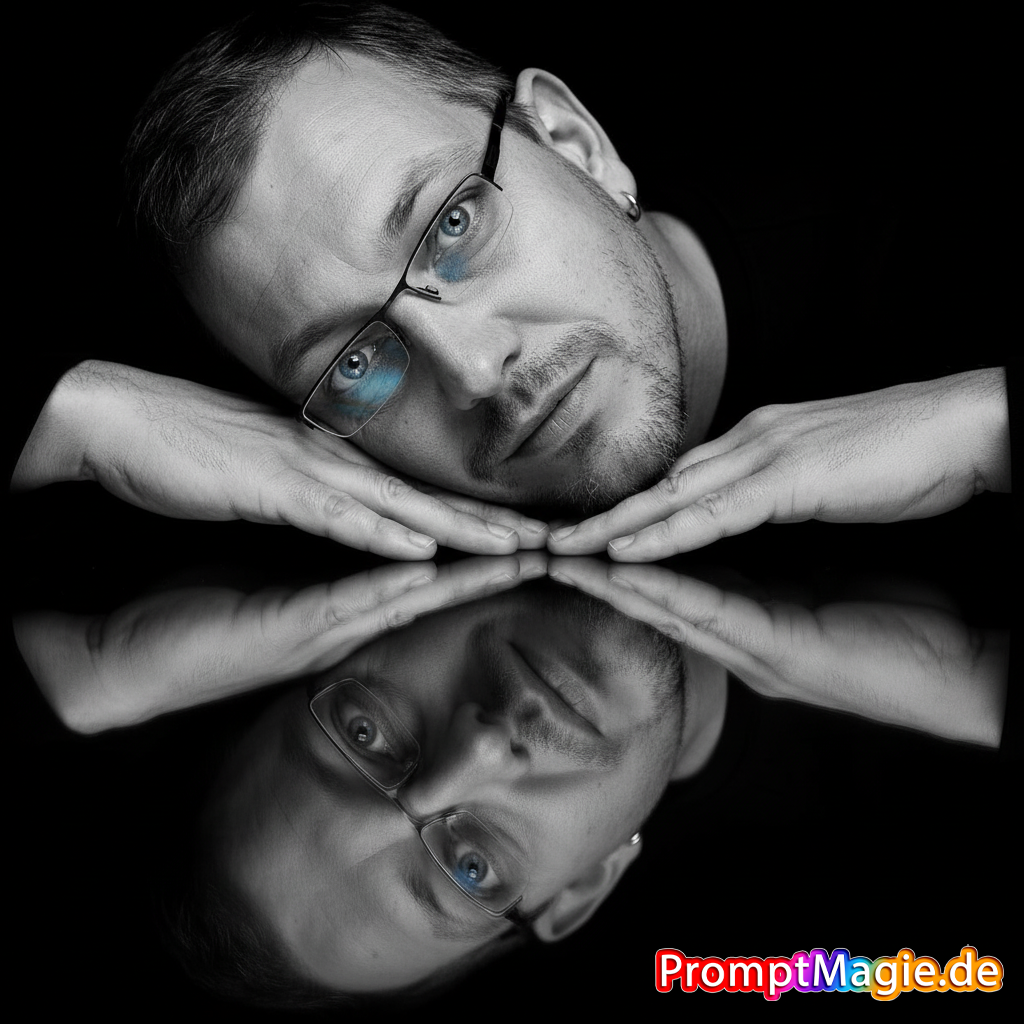 Ultra-photorealistic, filmisches Schwarz-Weiß-PortrĂ€t von hochgeladenem Motiv, das mit sanft auf dem Boden liegendem Kopf liegt. Unter dem Kopf sind die HĂ€nde. Das Gesicht des Motivs spiegelt sich perfekt auf einer glĂ€nzenden, dunklen, spiegelnden OberflĂ€che darunter, die sich klar und detailliert spiegelt.