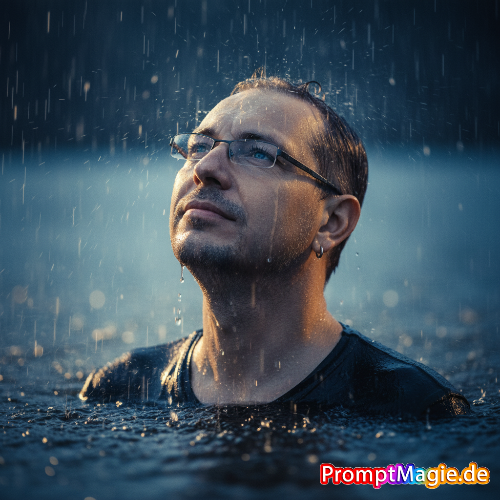 Hohe Auflösung eines scharfen Bildes. Erstellen Sie eine Nahaufnahme mit einem 3 / 4-Bild mit starkem Kontrast 35mm Filmporträt in Wasser bis zu den Schultern. Regen weichen Blautönen und einem weichen Gesichtsausdruck. Aufhellung im Hintergrund verschwommen. Kopf leicht nach hinten geneigt, als ob ich nach oben schaue. Stürmische Noodie-Ästhetik mit dunklen tiefen Blautönen mit kühler Palette, aber warmen Highlights. Behalte mein Gesicht so wie es ist, füge Wimpern hinzu Hohe Auflösung eines scharfen Bildes.