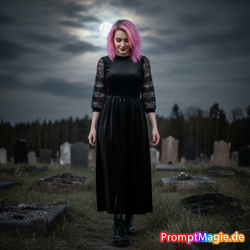 Verwenden Sie 100% Gesicht über des hochgeladen Fotos Cinematic 8K Weitwinkel niedrigen Winkel Schuss: junge Frau identisch wie auf dem Referenzbild mit rosa Haarfarbe,exakt wie auf dem hochgeladenen Foto, mit einem schwarzen samt kleid die Ärmel aus Spitze mit samt verziehrung und schwarzen Plateau der marke dr martens.Sie hat ein Septum und ein nasen piercing, schwarzen Fingernägel.sie ist zu Fuß auf einem verlassenen friedhof unterwegs. Bei Vollmond. Ihr Kopf Blick nach unten und sie lächelt. Vordergrund scharf, Hintergrund Bokeh, kaputte alte grabsteine, dramatischen Himmel, mit Mond im rücken, ferner wald natürliche Farbe Grading, weiches weißes Licht, Stimmung der Einsamkeit. Ganz körper Aufnahme.