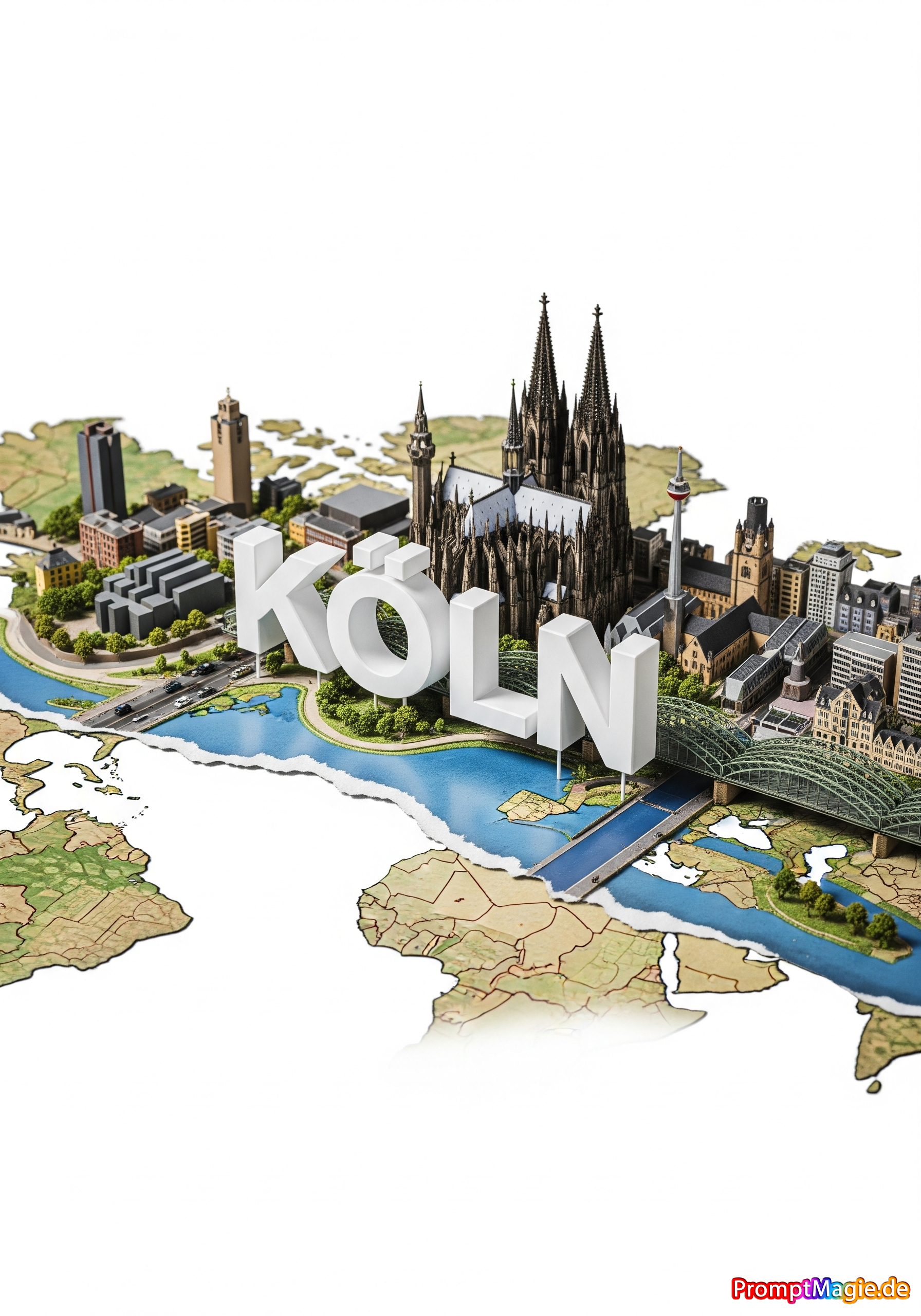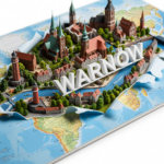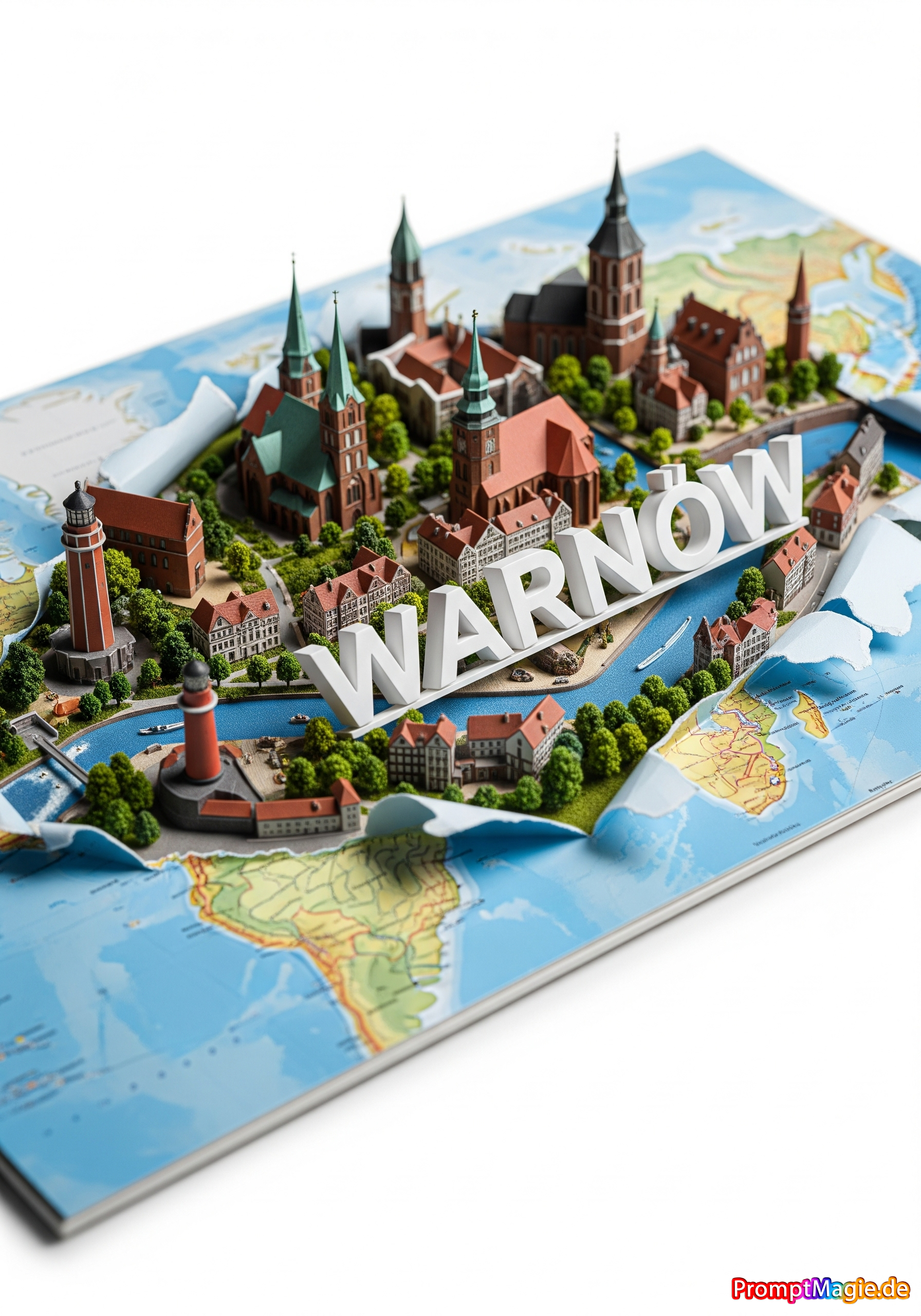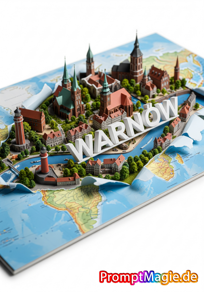 Erstelle ein stilvolles Poster im Seitenverhältnis 3:4 mit einem Miniatur-3D-Modell von Warnow, das die wichtigsten Sehenswürdigkeiten präsentiert und durch eine zerrissene, horizontal angelegte physische Weltkarte hervorsticht, die sich nahtlos in das Design integriert. Eine weiße, elegante 3D-Darstellung des Stadtnamens WARNOW fügt sich organisch in die Stadtlandschaft ein. Verwenden Sie einen dynamischen Kamerawinkel und eine dramatische Perspektive für Tiefe mit natürlichen und dennoch lebendigen Farben. Verwenden Sie Studiobeleuchtung für scharfen, detailreichen Kontrast vor einem sauberen weißen Hintergrund. Das Bild sollte einem professionellen DSLR-Foto ähneln – gestochen scharf, hochauflösend und optisch beeindruckend, und Realismus mit künstlerischem Flair verbinden.