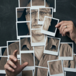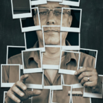A hyper-realistic, 8k, high-fidelity studio shot captures a surreal collage where a human figure is meticulously constructed from numerous overlapping instant photo prints, each with distinct white borders, against a dark, textured, distressed background resembling an old chalkboard or worn wall, featuring a subtle vignette. The composition is a medium shot, straight-on, with an eye-level perspective, utilizing a standard lens to maintain natural proportions. Soft, cinematic studio lighting illuminates the scene, casting subtle, realistic shadows from each instant photo print onto the background and from overlapping prints onto one another, creating a profound sense of depth and three-dimensionality. The images within the instant photo prints are rendered in a desaturated, monochromatic, or sepia-toned palette with a slight cool tint, while the overall image maintains a muted, cool-toned aesthetic. The figure’s face is formed by several instant photos, showing parts of the face, for which the uploaded face as reference should be used. Other prints depict parts of the neck, shoulders, and torso, revealing a casual, collared shirt worn over a t-shirt, with highly detailed textures of the fabric and its wrinkles. One hand on the right side of the frame is delicately reaching out, pinching the corner of an instant photo print between its thumb and forefinger, showcasing a subtle ring on the ring finger, while another hand on the left also reaches out, fingers slightly curled. The „Photoshop logic“ is evident in the precise arrangement of these approximately 15-20 instant photos, forming a cohesive human shape that appears to float slightly above the background.