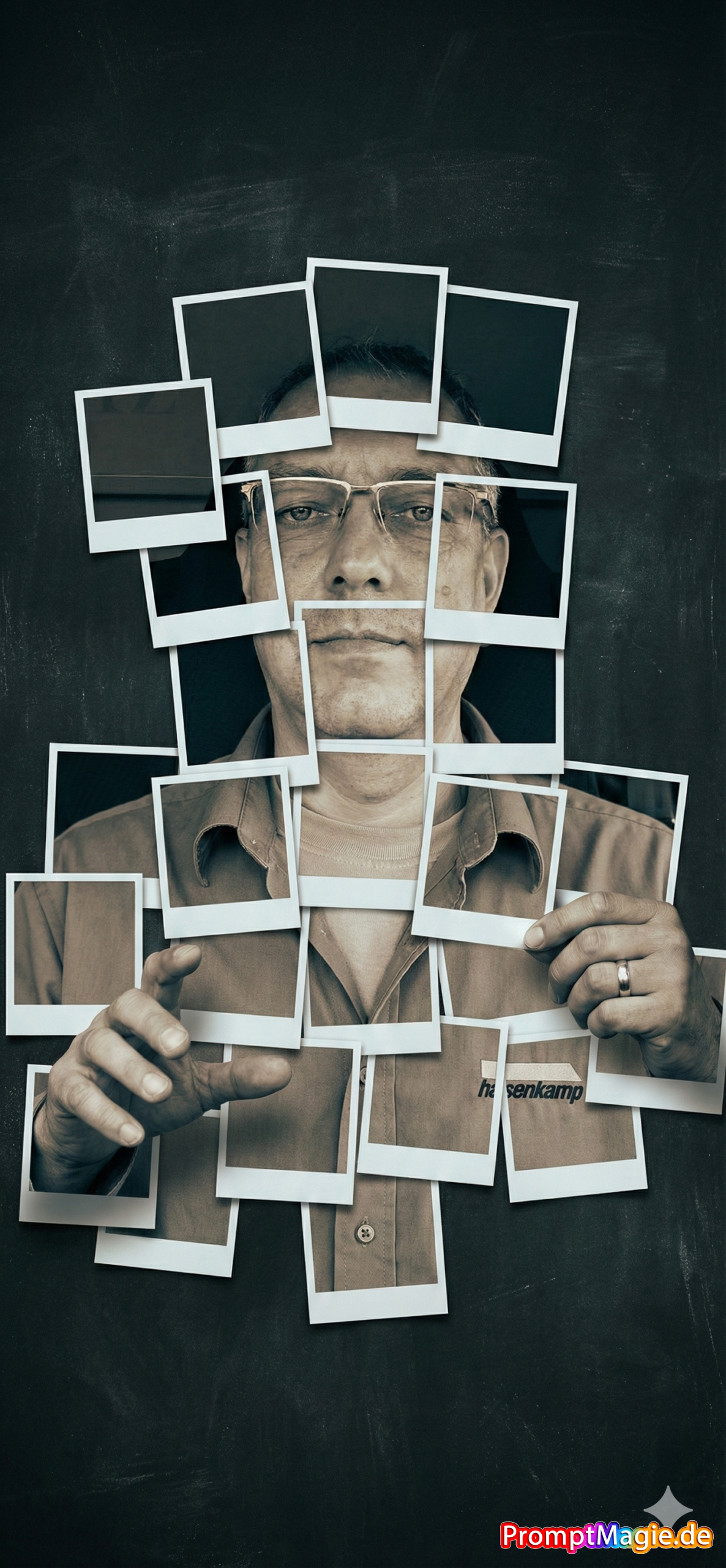 A hyper-realistic, 8k, high-fidelity studio shot captures a surreal collage where a human figure is meticulously constructed from numerous overlapping instant photo prints, each with distinct white borders, against a dark, textured, distressed background resembling an old chalkboard or worn wall, featuring a subtle vignette. The composition is a medium shot, straight-on, with an eye-level perspective, utilizing a standard lens to maintain natural proportions. Soft, cinematic studio lighting illuminates the scene, casting subtle, realistic shadows from each instant photo print onto the background and from overlapping prints onto one another, creating a profound sense of depth and three-dimensionality. The images within the instant photo prints are rendered in a desaturated, monochromatic, or sepia-toned palette with a slight cool tint, while the overall image maintains a muted, cool-toned aesthetic. The figure’s face is formed by several instant photos, showing parts of the face, for which the uploaded face as reference should be used. Other prints depict parts of the neck, shoulders, and torso, revealing a casual, collared shirt worn over a t-shirt, with highly detailed textures of the fabric and its wrinkles. One hand on the right side of the frame is delicately reaching out, pinching the corner of an instant photo print between its thumb and forefinger, showcasing a subtle ring on the ring finger, while another hand on the left also reaches out, fingers slightly curled. The „Photoshop logic“ is evident in the precise arrangement of these approximately 15-20 instant photos, forming a cohesive human shape that appears to float slightly above the background.