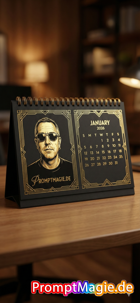 Motiv: Porträt eines Mannes (Referenzbild) mit Sonnenbrille und schwarzem T-Shirt (links), Schriftzug „PROMPTMAGIE.DE “ in goldener Signaturschrift. Rechts: Kalenderraster für Januar 2026.