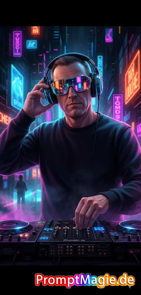Erstelle Ein lebendiges, detailreiches digitales Kunstwerk eines DJs (Referenzbild) mit Neonlichteffekten. Er trägt eine große, verspiegelte Sonnenbrille, die das Neonlicht reflektiert. Sein Blick wirkt selbstbewusst und konzentriert. Er trägt Kopfhörer, die er mit einer Hand justiert, während er mit der anderen einen Plattenspieler bedient. Die Szene ist vor einem dunklen Hintergrund inszeniert, der das farbenfrohe Neonlicht hervorhebt und eine futuristische, energiegeladene Atmosphäre schafft. Zum DJ-Equipment gehören ein professioneller Mixer und zwei Plattenspieler, die dezent mit pinken und violetten Lichtakzenten beleuchtet werden. Der Stil ist vom Cyberpunk inspiriert und legt den Fokus auf leuchtende Neonelemente, kräftige Farben und eine dynamische, mitreißende Wirkung.