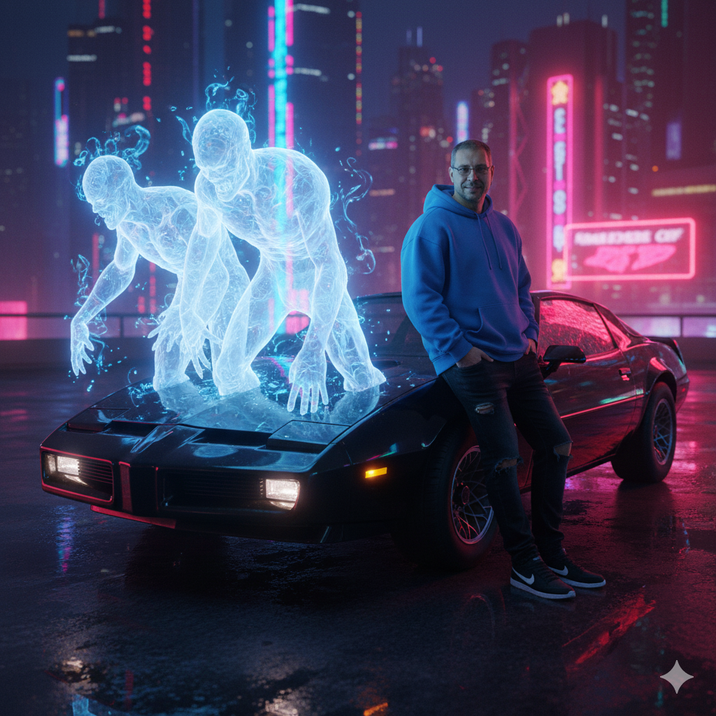 Er trägt einen übergroßen blauenHoodie, zerrissene schwarze Jeans und Nike-Sneaker. Selbstbewusst lehnt er an K.I.T.T, aus deren Spitze drei geisterhafte, monströse Gestalten dramatisch hervortreten – leuchtend, halbtransparent und leicht verzerrt durch einen spektralen Energieeffekt.