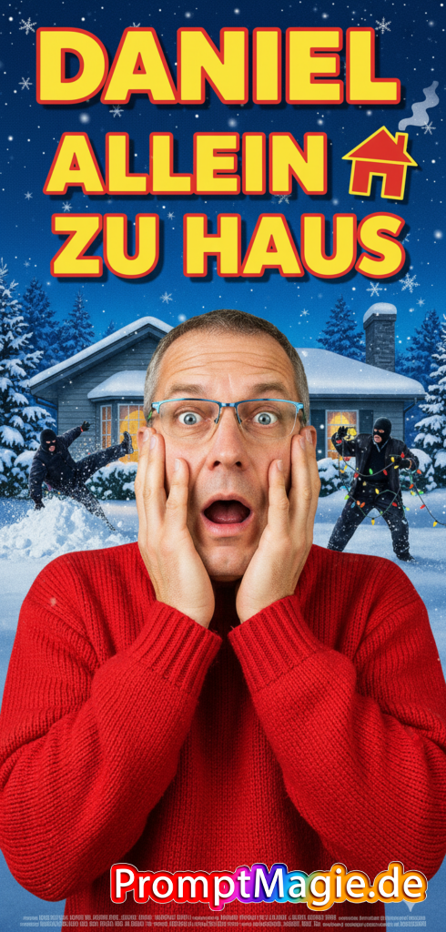 Erstelle ein Bild / Filmplakat im Stil der 1990er Jahre für eine lustige Weihnachtskomödie. Im Vordergrund steht ein Mann (Referenzbild)mit einem roten Pullover, der erschrocken sein Gesicht mit den Händen hält. Im Hintergrund sind zwei tollpatschige Einbrecher mit dunkler Kleidung und Mützen zu sehen, die sich an ein Haus im Schnee anschleichen. Über allem steht der Titel „DANIEL ALLEIN ZU HAUS“ in großen, gelben Buchstaben mit einem roten Haus-Symbol. Die Stimmung ist winterlich, humorvoll und leicht chaotisch, mit einem blauen Nachthimmel und glitzernden Schneeflocken