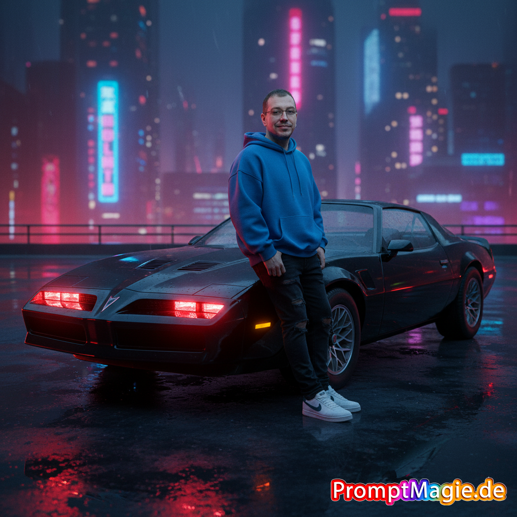 Er trägt einen übergroßen blauen-Hoodie, zerrissene schwarze Jeans und Nike-Sneaker. Selbstbewusst lehnt er an K.I.T.T, der Scanner leuchtet rot,