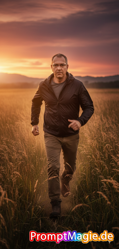 Eine hyperdetaillierte, filmische Szene, in der das hochgeladene Gesicht als Referenz fĂŒr eine Figur dient, die in der AbenddĂ€mmerung durch ein hohes Grasfeld rennt. Die Kamera fĂ€ngt den Protagonisten gestochen scharf und mit dramatischer PrĂ€senz im Zentrum des Bildes ein. Er trĂ€gt eine dunkle, leichte Windjacke, deren Nylonstoff raschelt, ĂŒber einem einfachen T-Shirt, dazu robuste Khakihosen und Trailrunning-Stiefel. Er sprintet durch ein weites, verwildertes Feld, das hohe Gras wiegt sich heftig um ihn herum, erleuchtet vom letzten goldenen Licht der untergehenden Sonne. Dichte AtmosphĂ€re. Verwenden Sie eine von Premium-Fotografie inspirierte Bildsprache und professionelle Bildbearbeitungstechniken, Ă€hnlich wie in High-End-Photoshop, um höchste RealitĂ€tsnĂ€he ohne CGI oder 3D-Grafiken zu erzielen. Erschaffen Sie eine einzigartige, unvergessliche Szene mit unvergleichlicher Detailgenauigkeit, filmischer Kraft und vollem Fokus auf den Protagonisten. Keine CGI- oder 3D-Grafiken oder -Kunst. Verwenden Sie Photoshop-Bearbeitung, falls die Szene unlogisch und fiktiv erscheint.