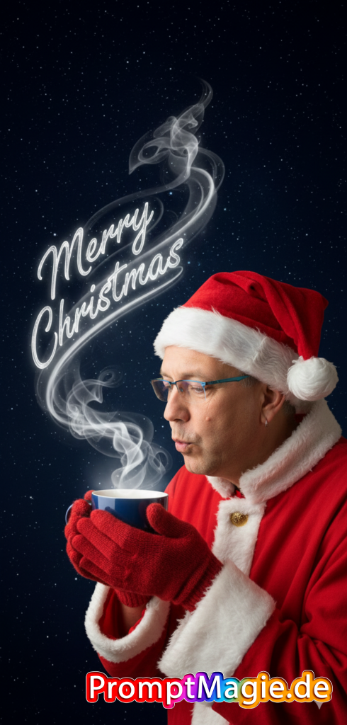 Ich (Referenzbild zu 99,9 % )habe eine Weihnachtsmütze ,weihnachtsjacke und rote Handschuhe .Man sieht mich leicht seitlich .Die hände sind aufgehalten und eine dunkelblaue Tasse sitzt drauf ,ich puste hinein und es kommt aufgewirbelter Dampf raus zeischen dem Schnee ein Schriftzug „Merry Christmas “ in der gleichen Bewegung .Der Hintergrund ist ein dunkler Sternenhimmel .Nahaufnahme in 8K-Auflösung